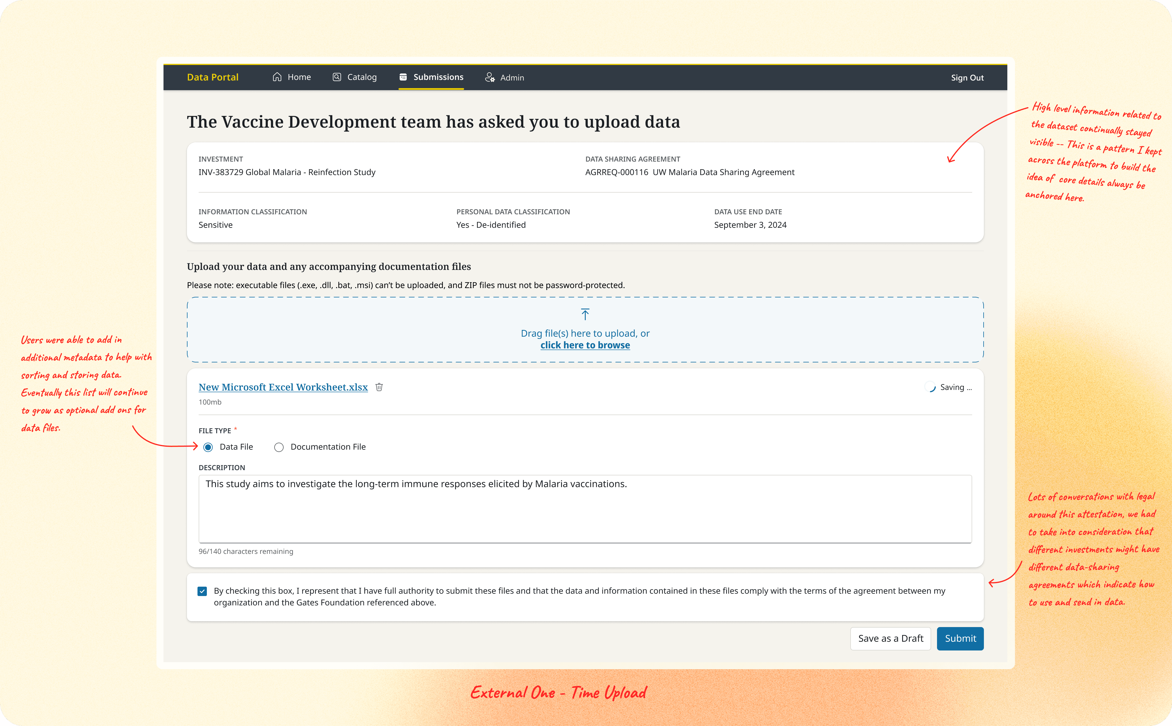 To support third-party grantees, I designed the MVP one-time secure upload flow, allowing external users to submit data and documentation with required metadata and descriptions. The flow provided clear submission confirmation and visibility into prior requests, ensuring contributors understood what had been received and what was still needed.