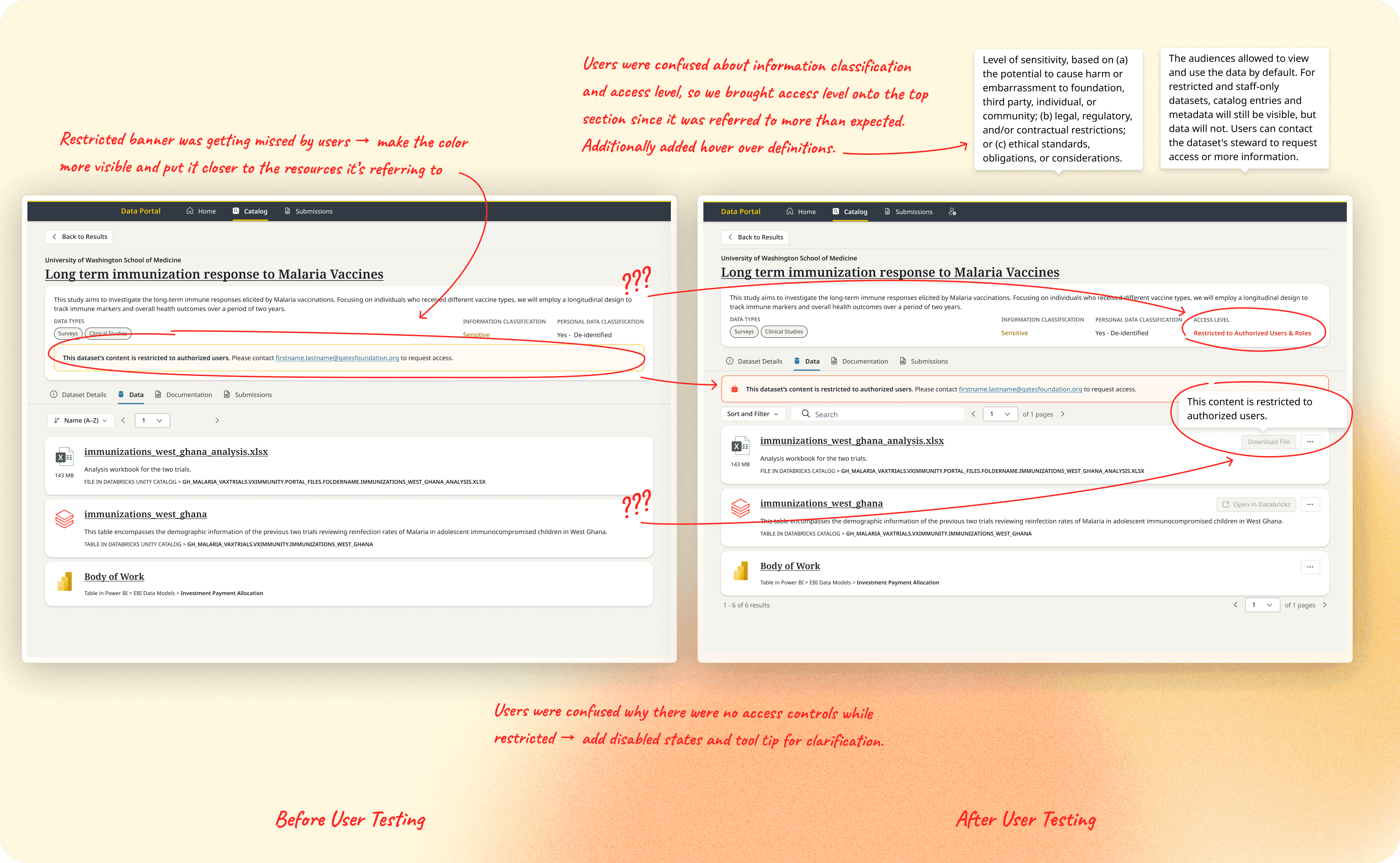 I adapted Fluent components where necessary and documented usage patterns to ensure consistency across MVP and future designs. Midway through the project, the Gates Foundation underwent a major rebrand. Because the Data Portal included external-facing elements, we collaborated with communications and branding partners to apply the new brand standards appropriately within an internal application which helped differentiate the platform and establish a clear visual identity moving forward.
