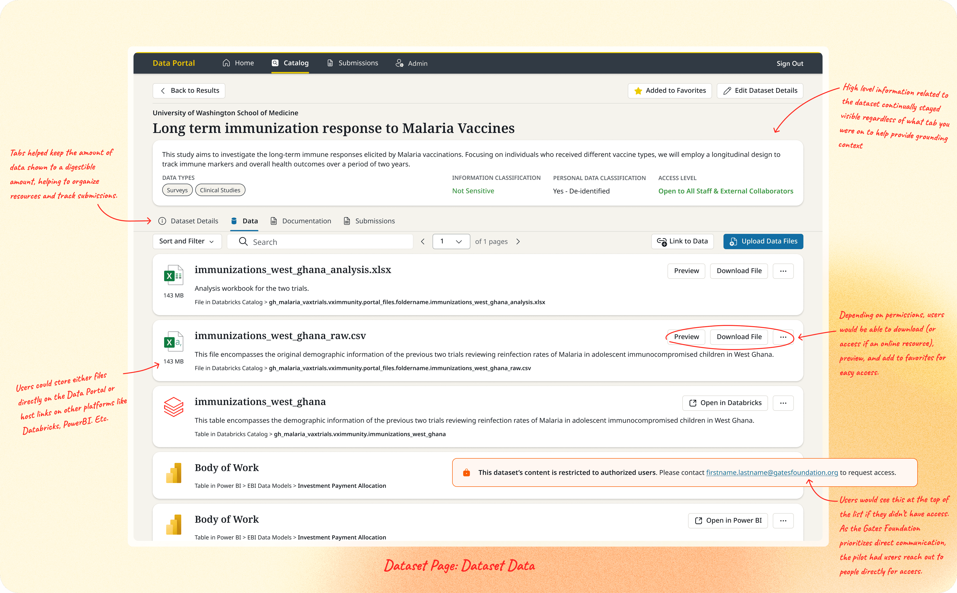 To prevent cognitive overload, I organized content into clear tabs for data files, documentation, and dataset details. I later designed a submissions view for Data Stewards, enabling them to track who was asked to submit data, submission status, and received files directly within the platform rather than relying on external tracking.