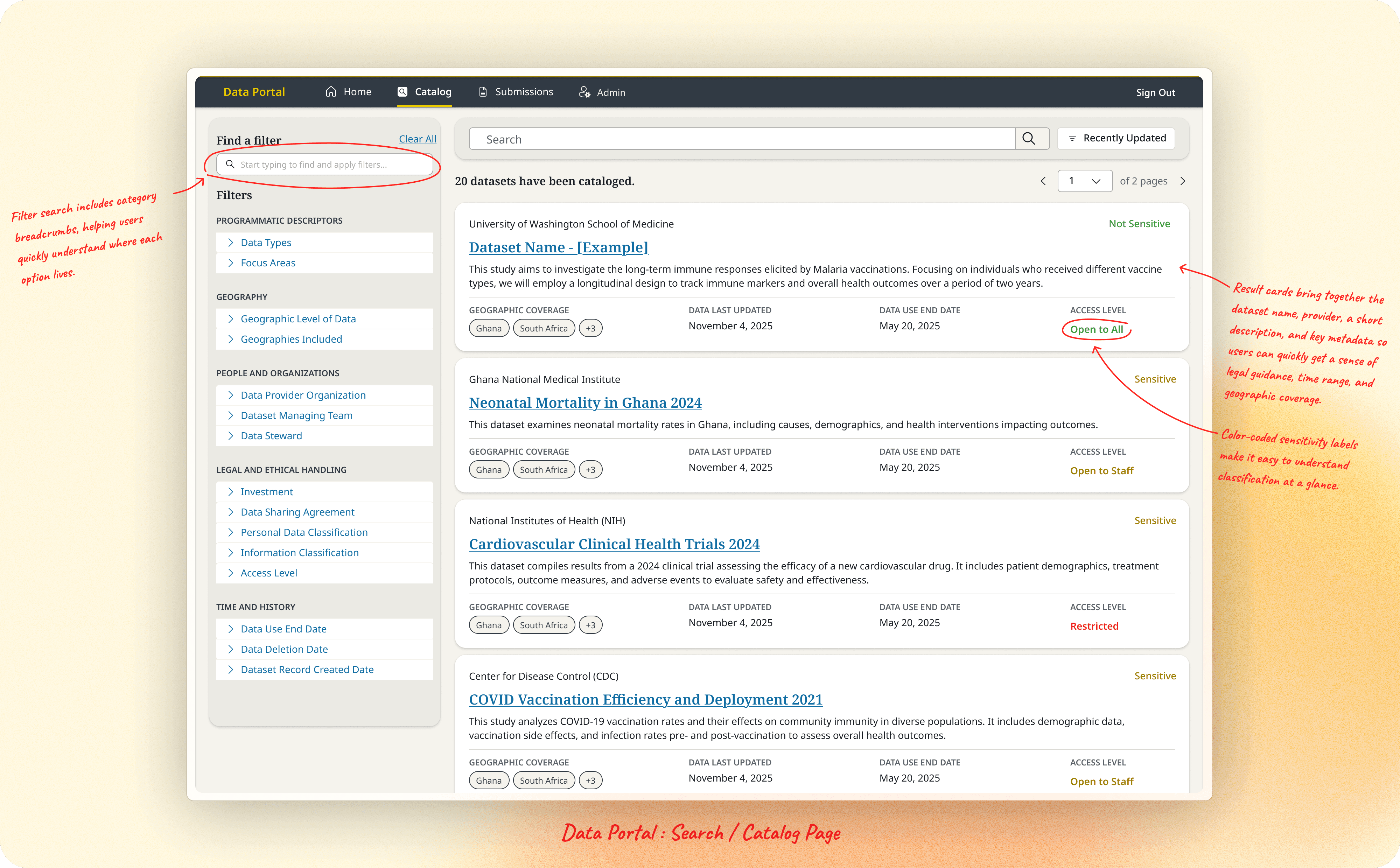 Search was a core pillar of the Data Portal experience. I designed dataset cards to surface the most important metadata at a glance, such as geographic coverage, update recency, and access level, helping users quickly assess relevance before diving deeper.
